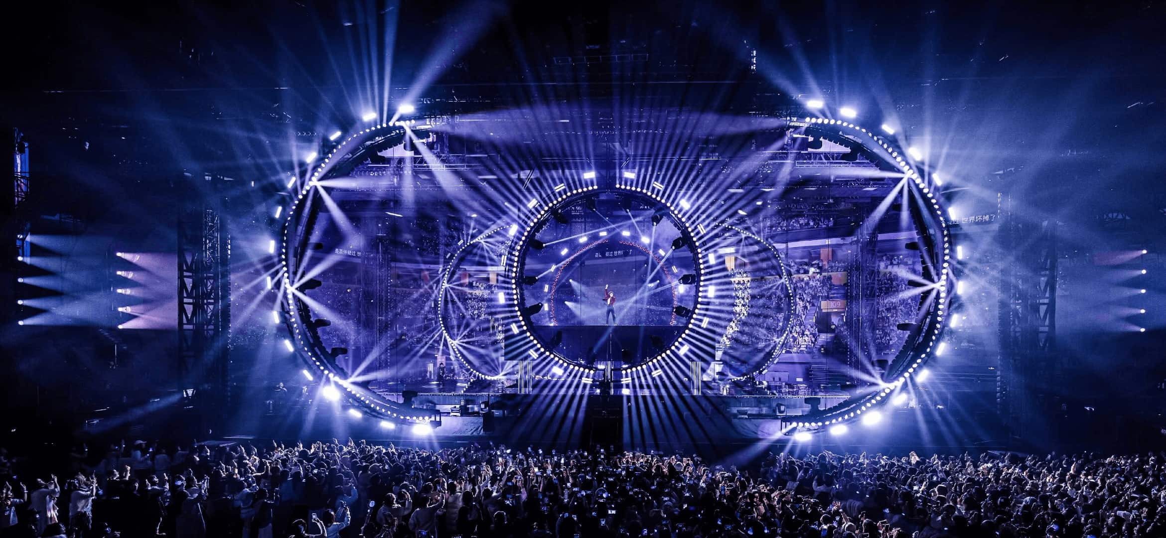 Design highlight: three giant ring-track lighting rigs form a gateway to a mysterious, cosmic space.